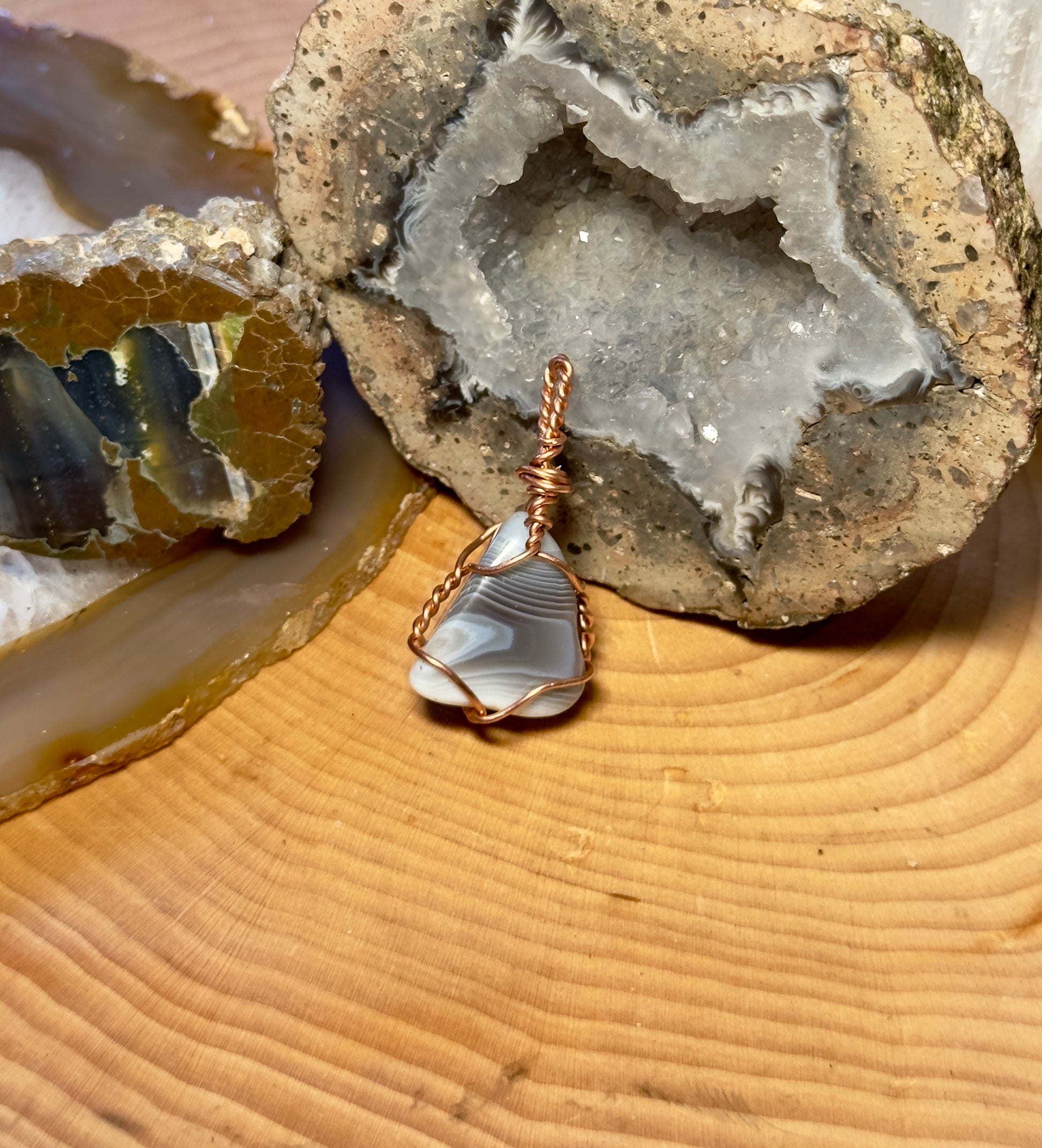 This pendant features a tumbled Botswana agate stone, carefully wrapped in copper wire by hand. The minimalist design highlights the natural beauty of the stone and adds a touch of earthy charm.