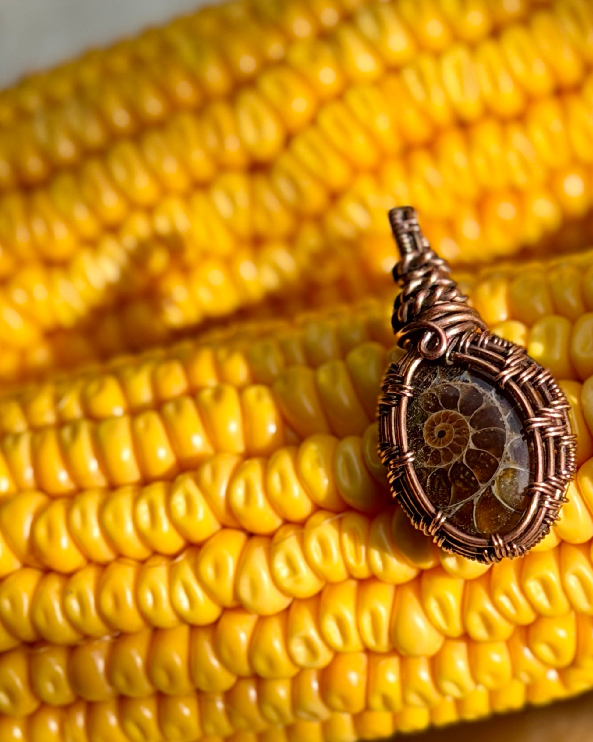 This pendant features a polished ammonite fossil, carefully wrapped in copper wire by hand and oxidized, to give it an aged appearance. The design highlights the natural beauty of the stone and adds a touch of earthy charm.