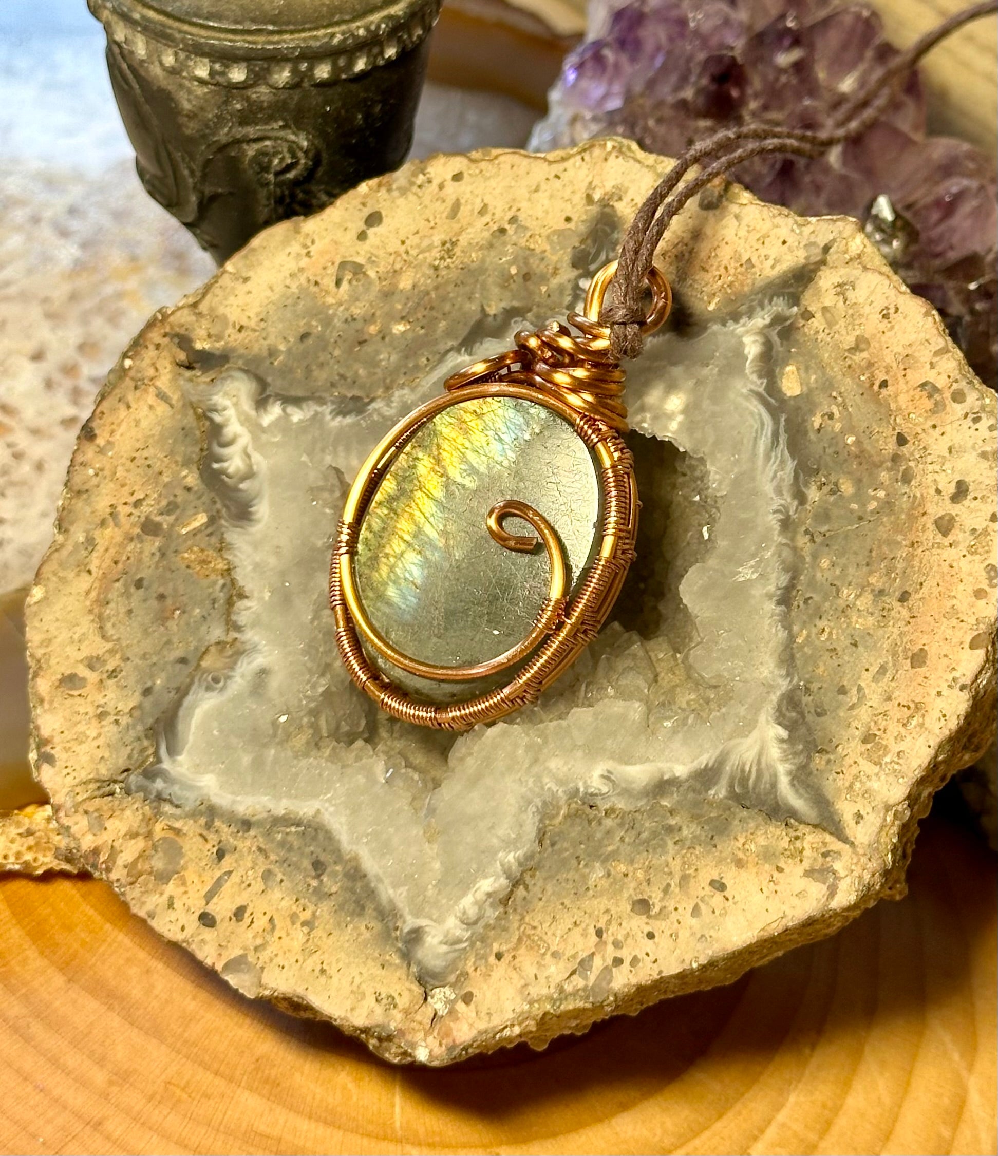 This pendant features a polished labradorite stone, carefully wrapped in copper wire by hand. The design highlights the natural beauty of the stone and adds a touch of earthy charm.