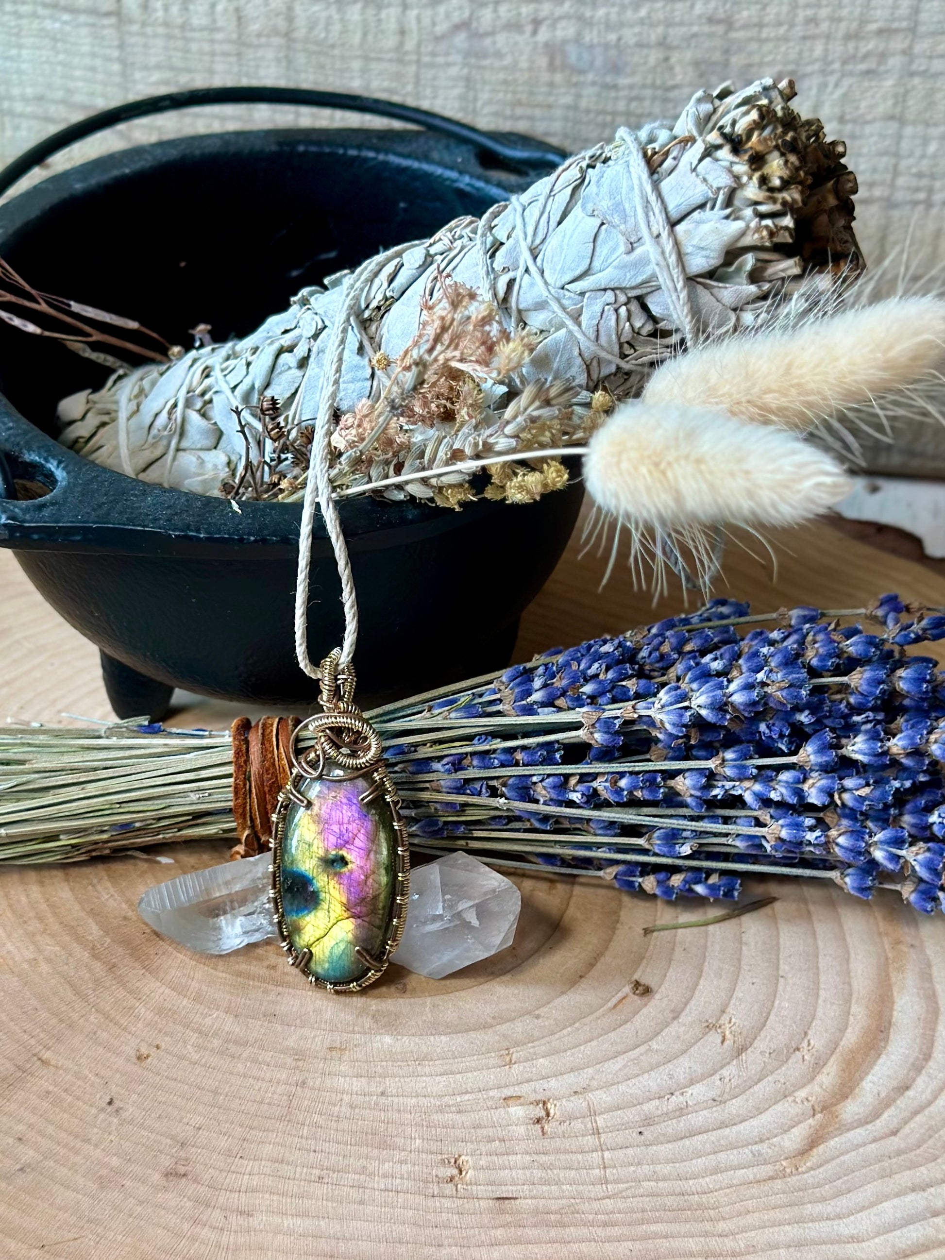 This pendant features a polished labradorite stone, carefully wrapped in copper wire by hand. The minimalist design highlights the natural beauty of the stone and adds a touch of earthy charm.