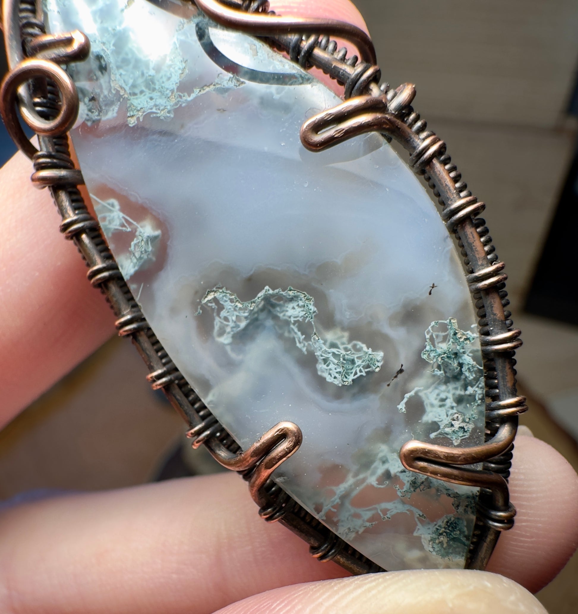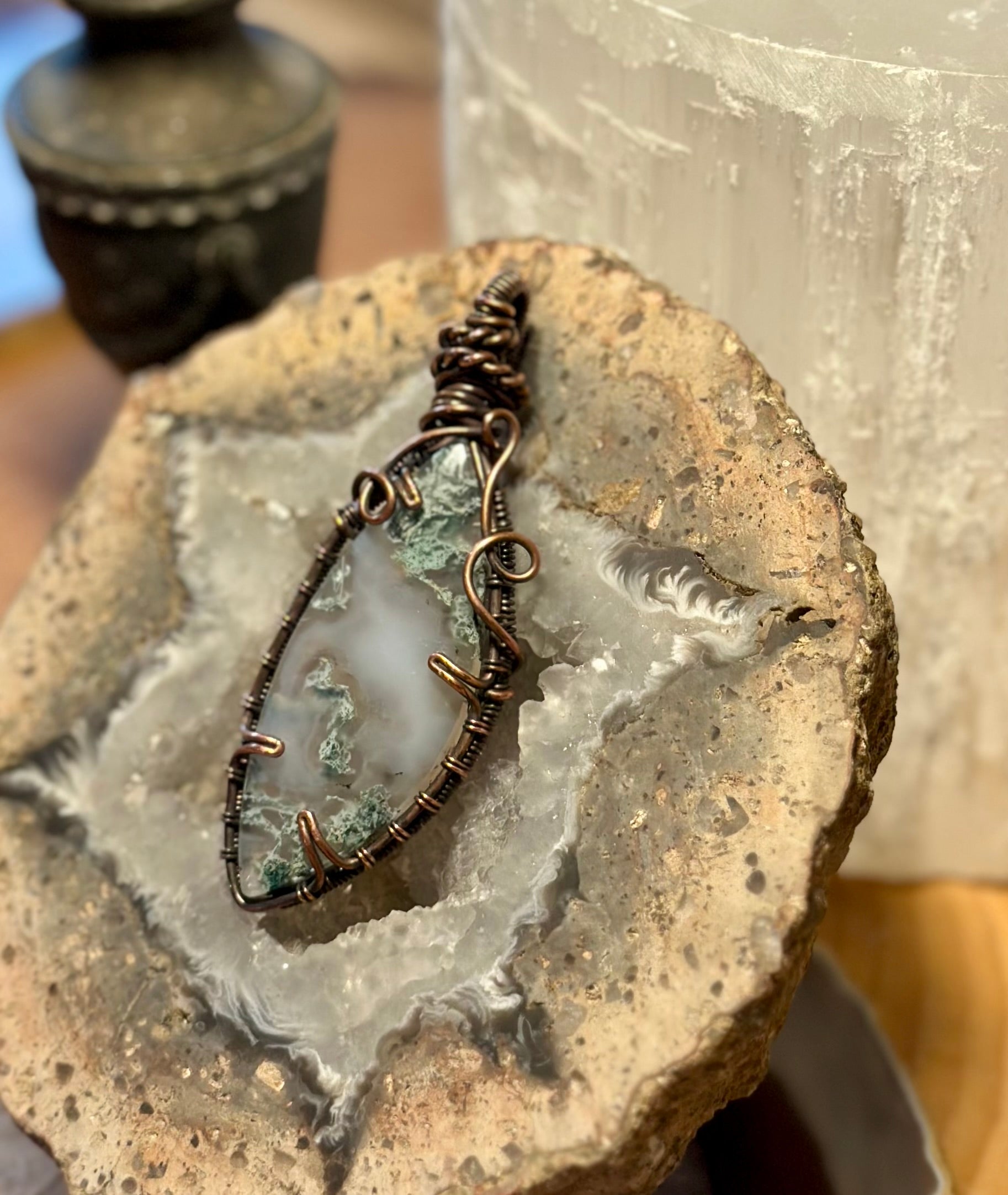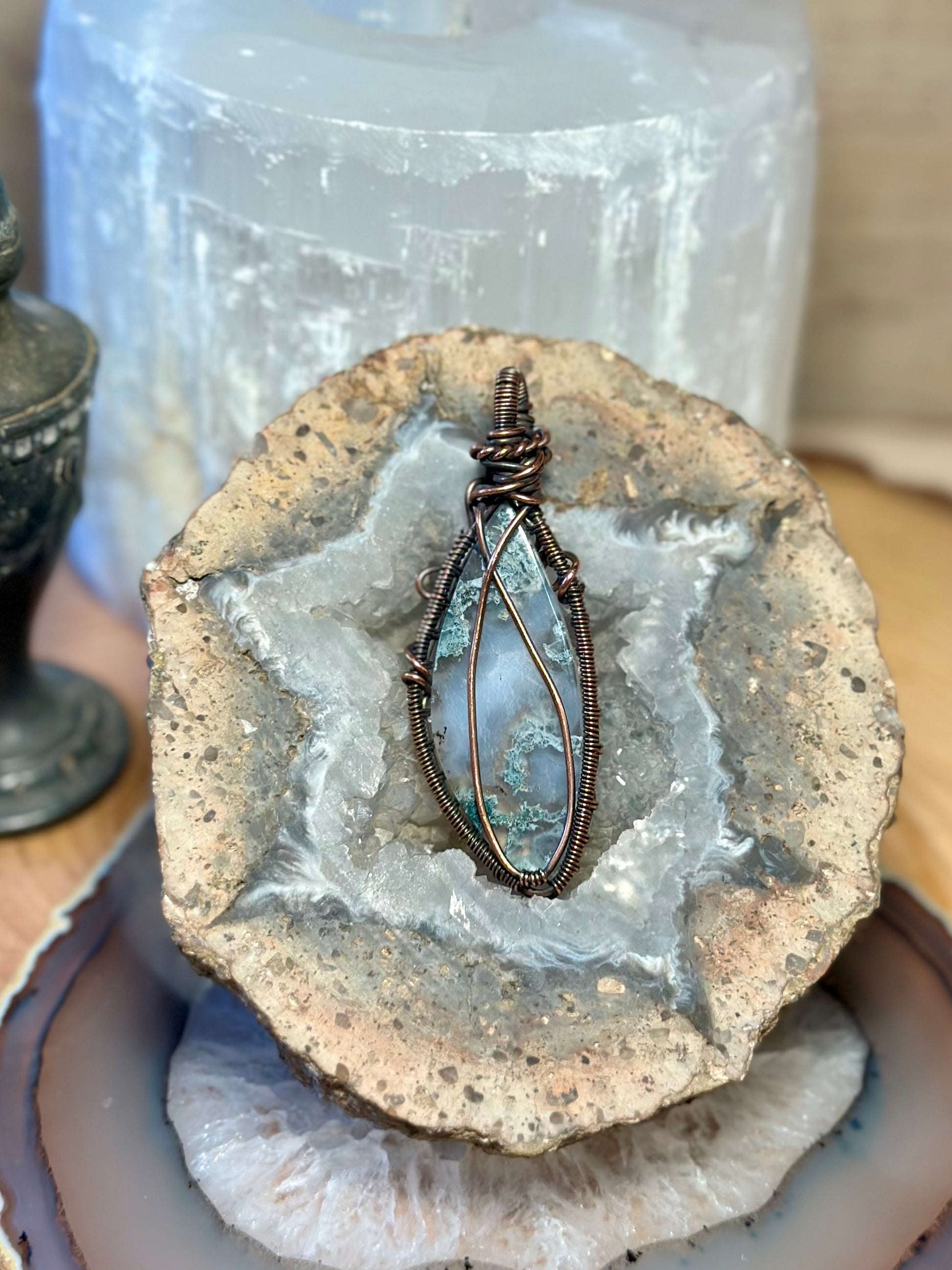 This pendant features a polished moss agate stone, carefully wrapped in copper wire by hand. The design highlights the natural beauty of the stone and adds a touch of earthy charm.