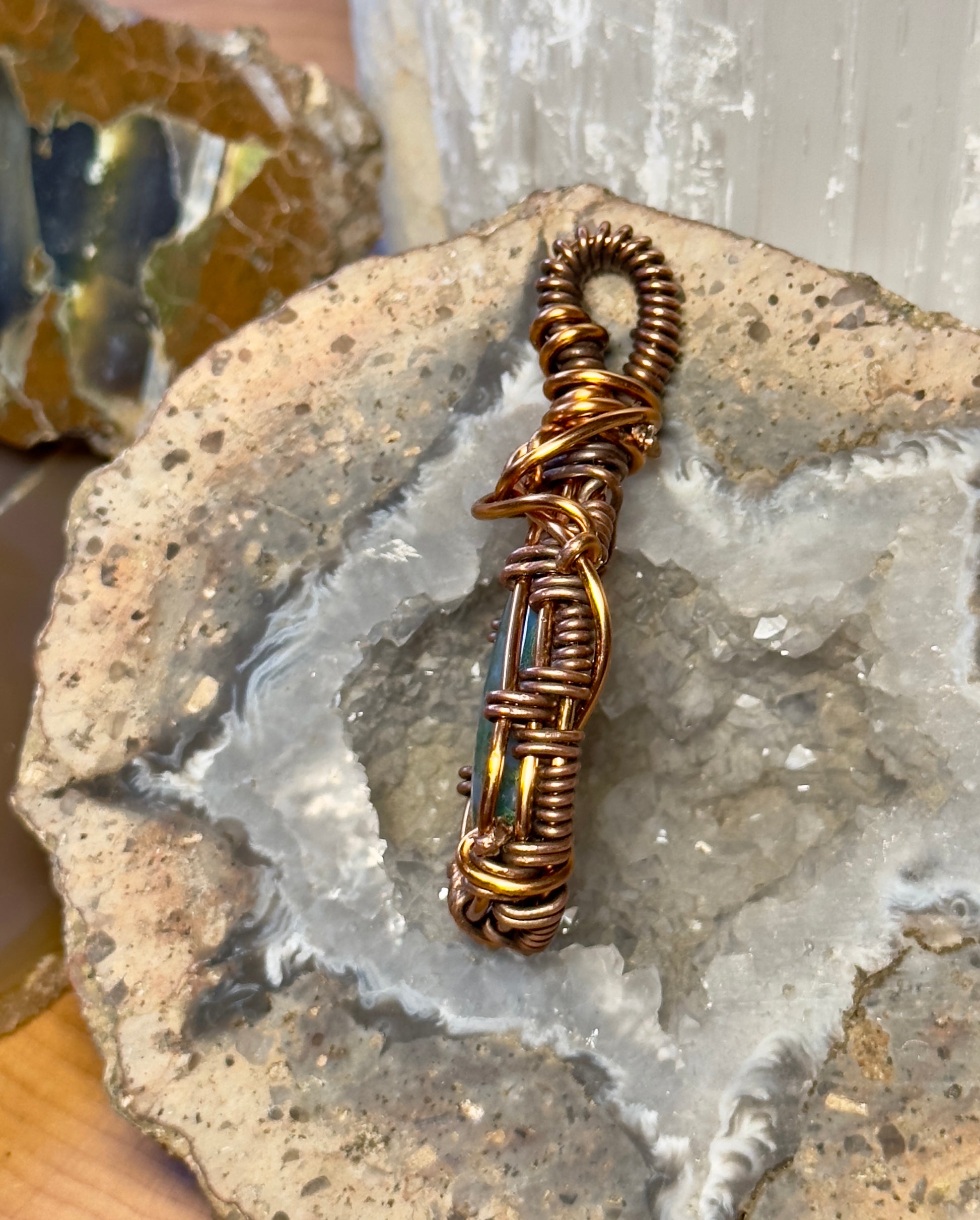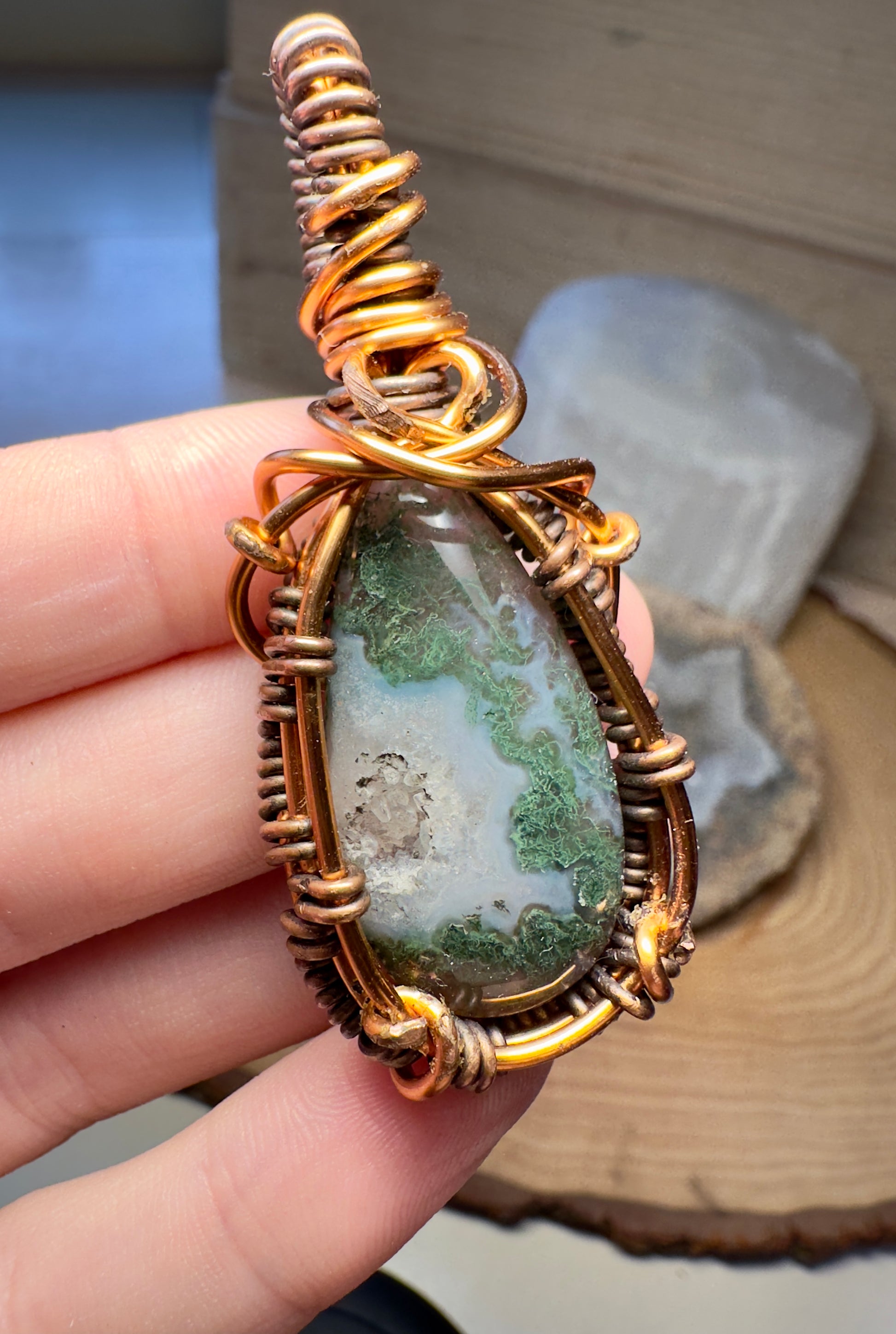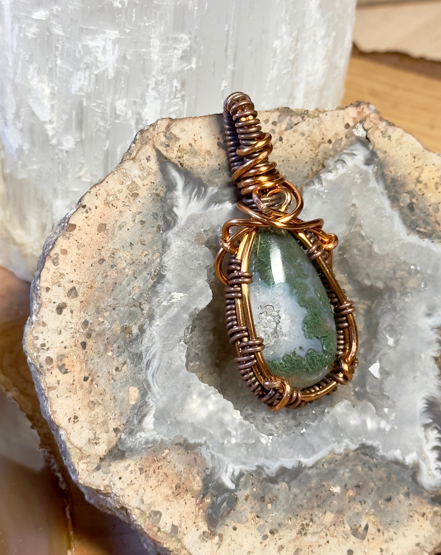 This pendant features a polished moss agate stone, carefully wrapped in copper wire by hand. The design highlights the natural beauty of the stone and adds a touch of earthy charm.