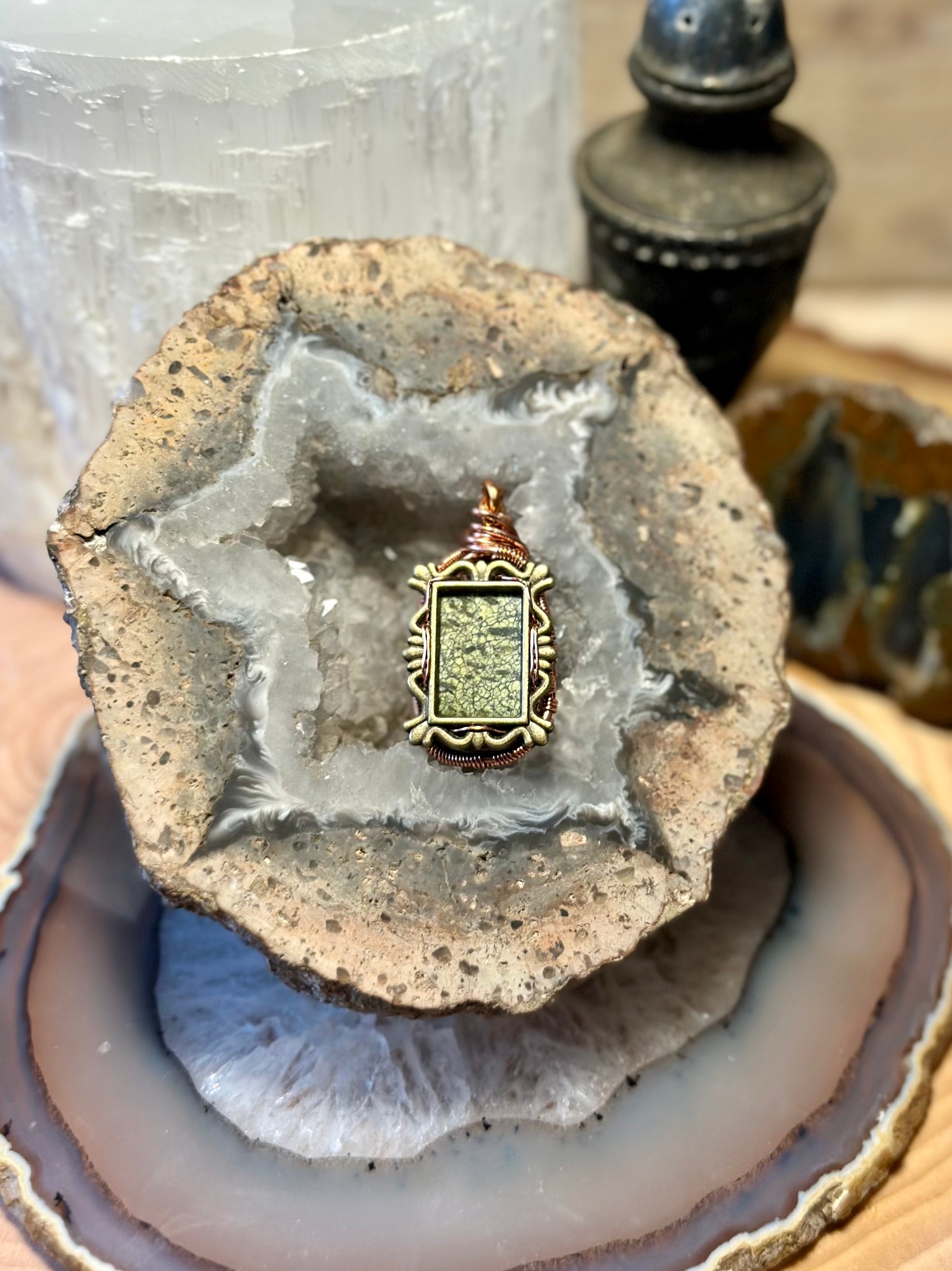 This pendant features a serpentine stone, carefully wrapped in copper wire by hand, with an added metal frame embellishment. The design highlights the natural beauty of the stone and adds a touch of earthy charm.