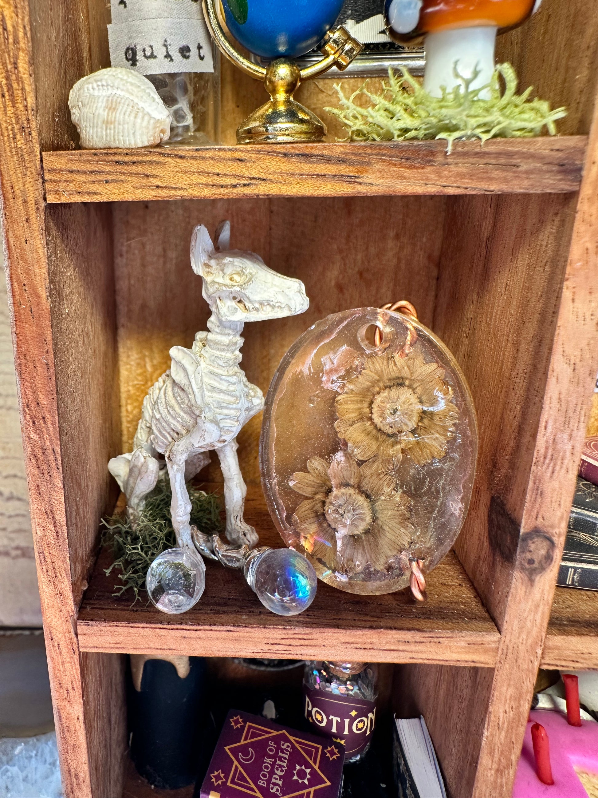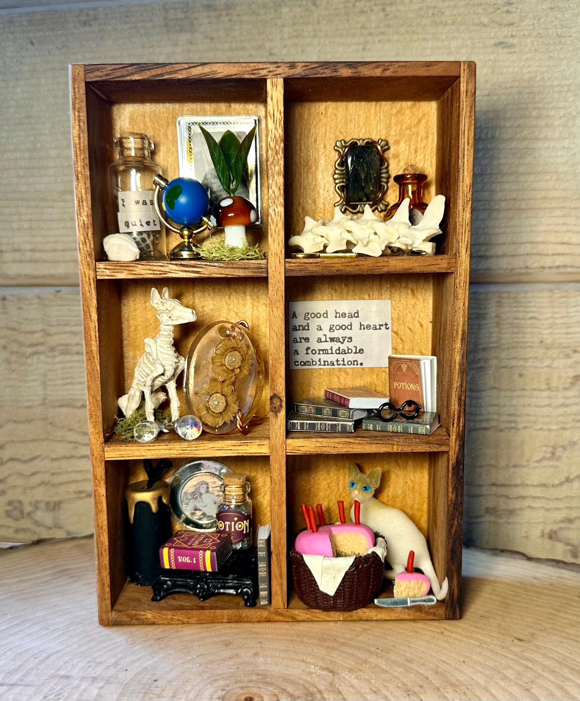 A whimsical wooden curiosity shelf filled with tiny treasures that spark imagination. Each compartment holds its own story — from books and potions to bones, and a thoughtful quote. Perfect for lovers of oddities, miniatures, and cozy magical décor.
