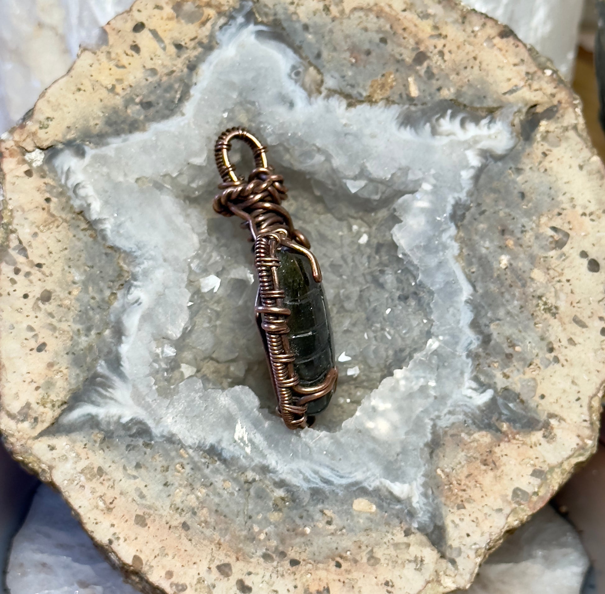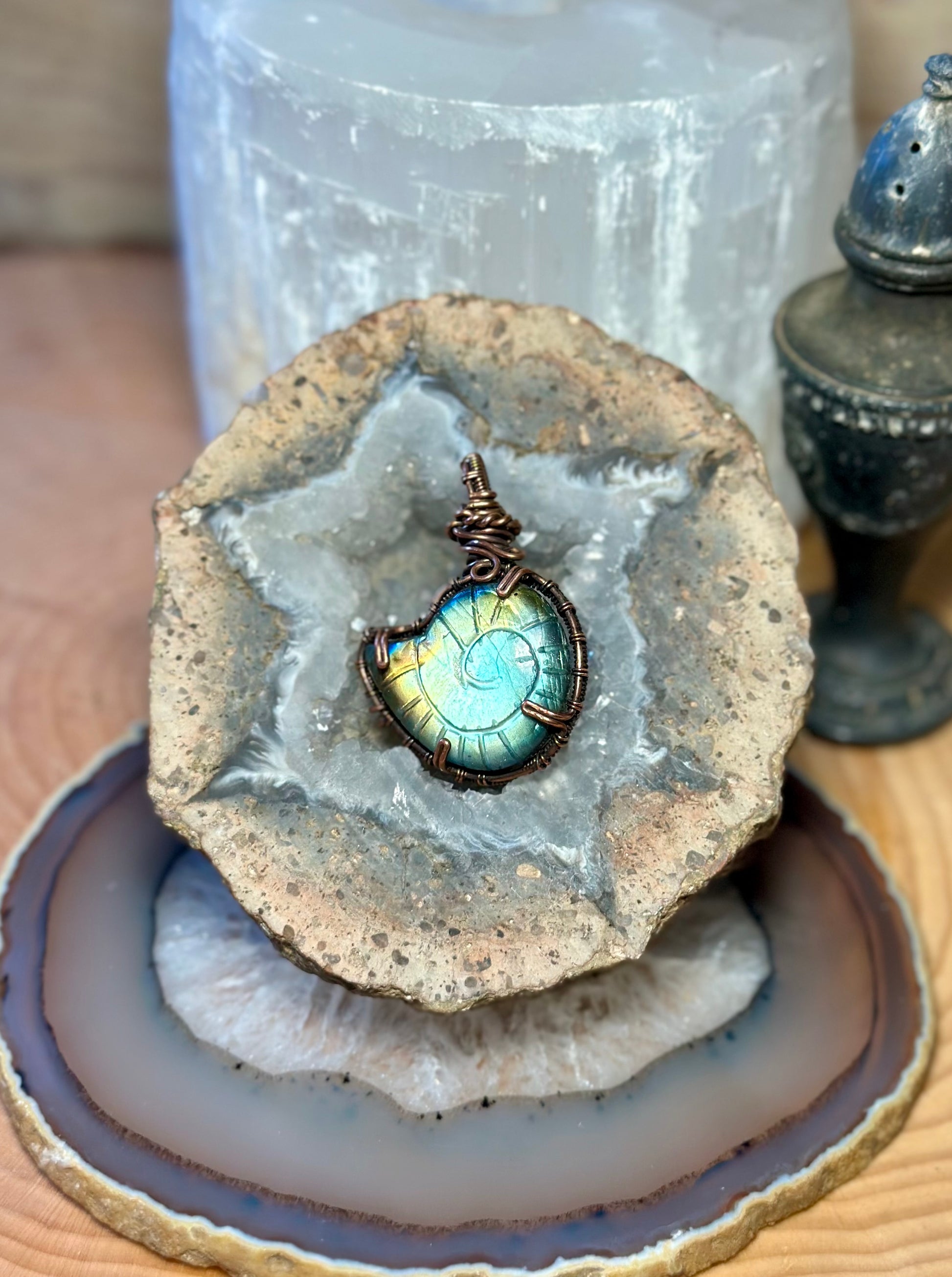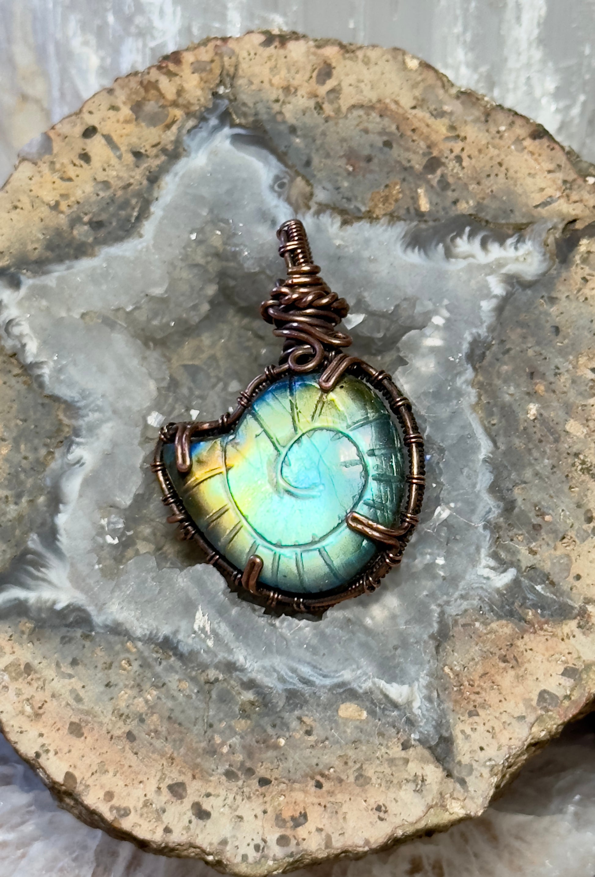 This pendant features a hand carved labradorite stone, carefully wrapped in copper wire by hand. The design highlights the natural beauty of the stone and adds a touch of earthy charm.